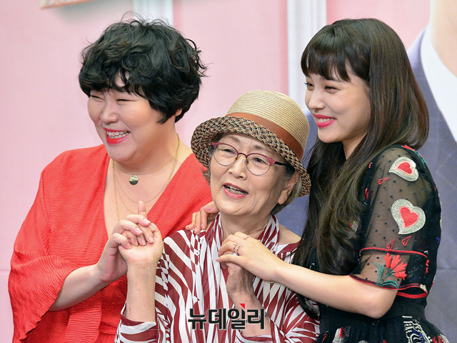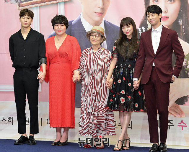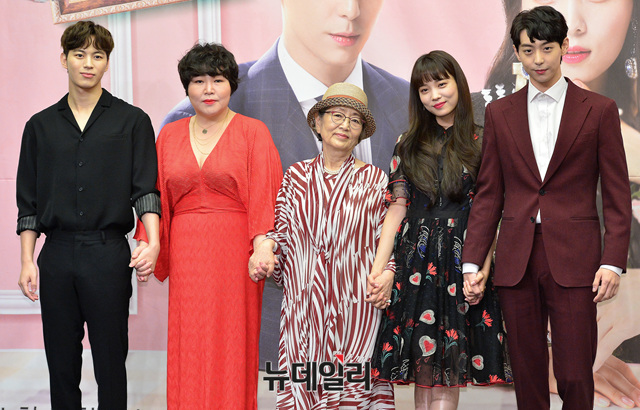 드라마 '마녀의사랑'의 배우들(윤소희, 현우, 홍빈, 고수희, 김영옥)이 24일 오전 서울 마포구 스탠포드호텔에서 열린 제작발표회에 참석해 포즈를 취하고 있다.