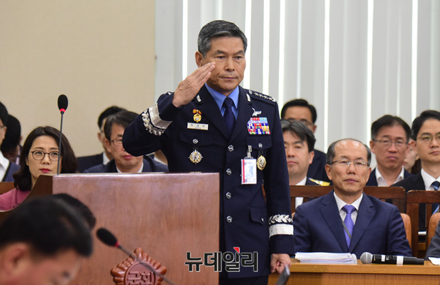 정경두 합참의장이 24일 오전 국회에서 진행된 국회 국방위원회 전체회의에 참석해 발언을 하고 있다.