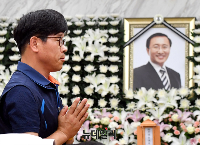 한상균 전 민노총 위원장이 24일 오전 서울 마포구 신촌세브란스병원 장례식장에 마련된 노회찬 정의당 원내대표 빈소를 찾아 조문하고 있다. 노 원내대표는 앞서 지난 23일 서울 중구의 한 아파트에서 투신해 사망했다.
