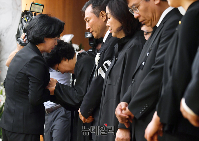 추미애 더불어민주당 대표가 24일 오전 서울 마포구 신촌세브란스병원 장례식장에 마련된 노회찬 정의당 원내대표 빈소를 나서고 있다. 노 원내대표는 앞서 지난 23일 서울 중구의 한 아파트에서 투신해 사망했다.