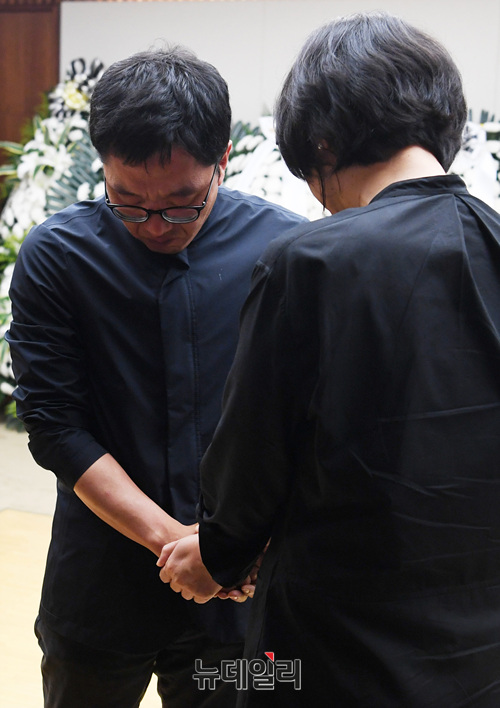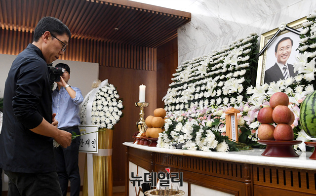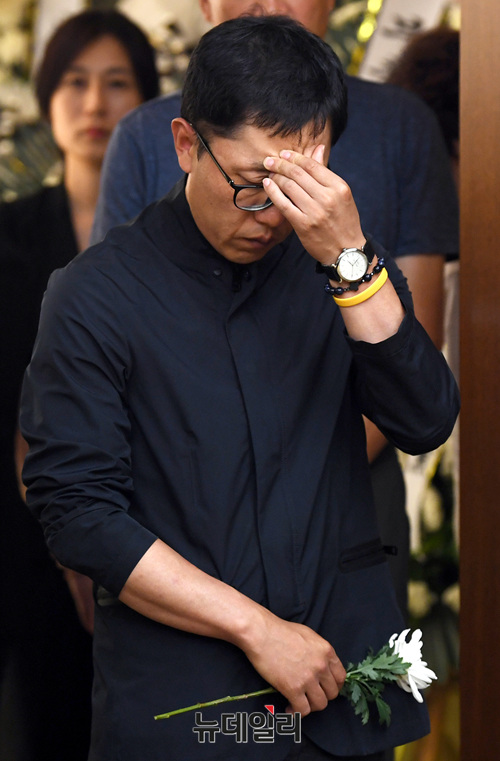 김제동이 24일 오후 서울 마포구 신촌세브란스병원 장례식장에 마련된 노회찬 정의당 원내대표 빈소를 찾아 조문하고 있다. 노 원내대표는 앞서 지난 23일 서울 중구의 한 아파트에서 투신해 사망했다.