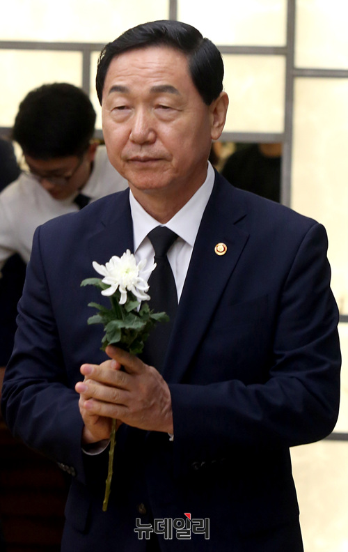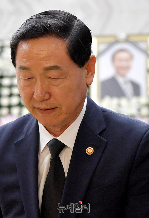 김상곤 교육부장관 겸 사회부총리가 24일 오후 서울 마포구 신촌세브란스병원 장례식장에 마련된 노회찬 정의당 원내대표 빈소를 찾아 조문하고 있다. 노 원내대표는 앞서 지난 23일 서울 중구의 한 아파트에서 투신해 사망했다.