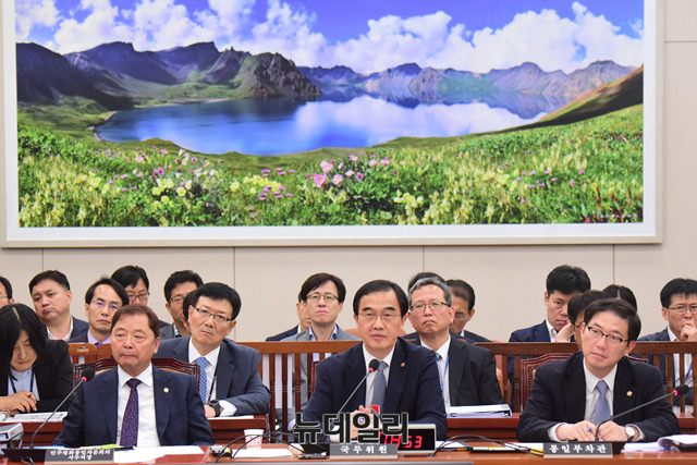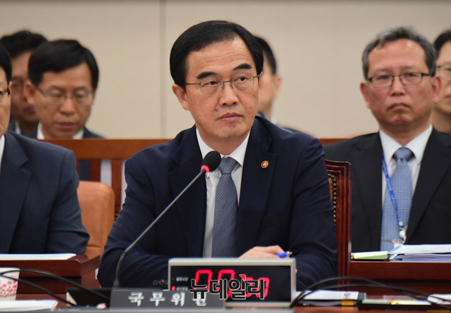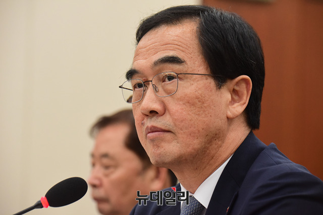 조명균 통일부 장관이 24일 오전 국회에서 열린 외교통일위원회 전체회의에 출석해 발언을 하고 있다.