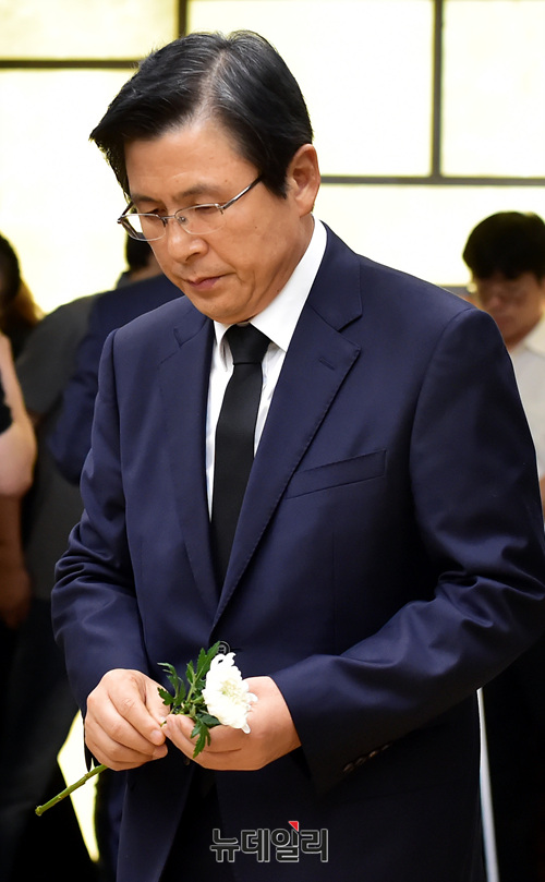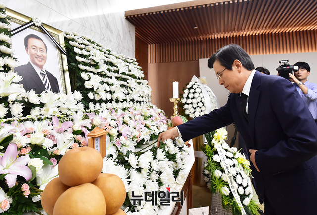 황교안 전 국무총리가 24일 오후 서울 마포구 신촌세브란스병원 장례식장에 마련된 노회찬 정의당 원내대표 빈소를 찾아 헌화하고 있다. 노 원내대표는 앞서 지난 23일 서울 중구의 한 아파트에서 투신해 사망했다.
