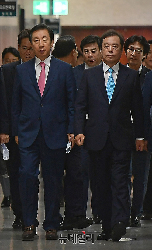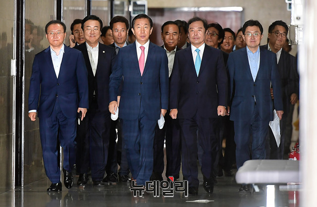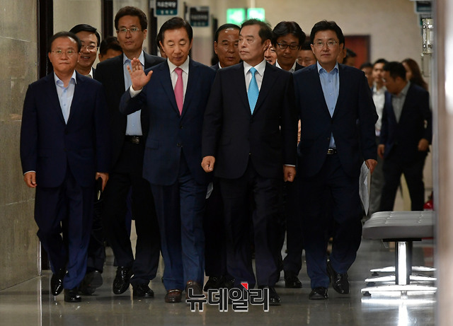 자유한국당 김병준 혁신비상대책위원장과 김성태 원내대표를 비롯한 비대위원들이 25일 국회에서 열린 자유한국당 첫 비상대책회의에 입장하고 있다. 앞서 비대위는 국립서울현충원을 찾아 참배했다.