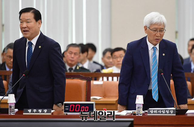 기찬수 병무청장(왼쪽)과 전제국 방위사업청장이 25일 오전 국회에서 열린 국회 국방위 전체회의에 앞서 대화를 나누고 있다.