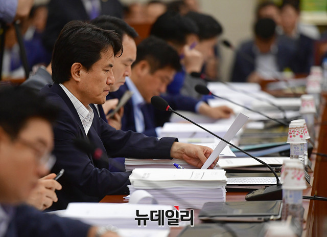 김진태 자유한국당 의원이 25일 오전 국회에서 열린 국회 정무위원회 전체회의에 참석해 자리하고 있다.