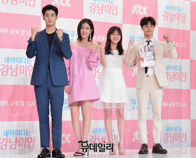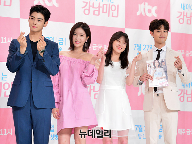 드라마 '내 아이디는 강남미인'의 배우들(임수향, 차은우, 조우리, 곽동연)이 26일 오후 서울 영등포구 타임스퀘어에서 열린 제작발표회에 참석해 포즈를 취하고 있다.