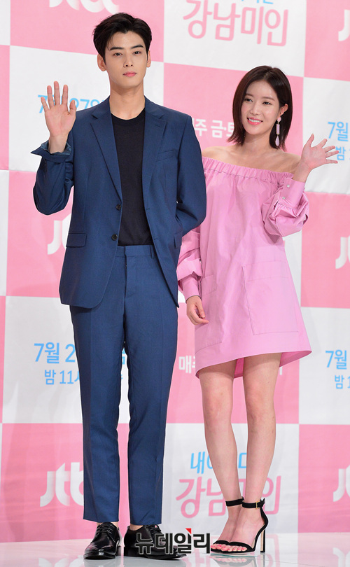 배우 임수향, 차은우가 26일 오후 서울 영등포구 타임스퀘어에서 열린 드라마 '내 아이디는 강남미인' 제작발표회에 참석해 포즈를 취하고 있다.