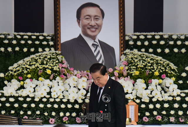 故 노회찬 정의당 의원의 영결식 27일 오전 국회에서 열린 가운데 문희상 국회의장이 헌화한 후 돌아서고 있다.
