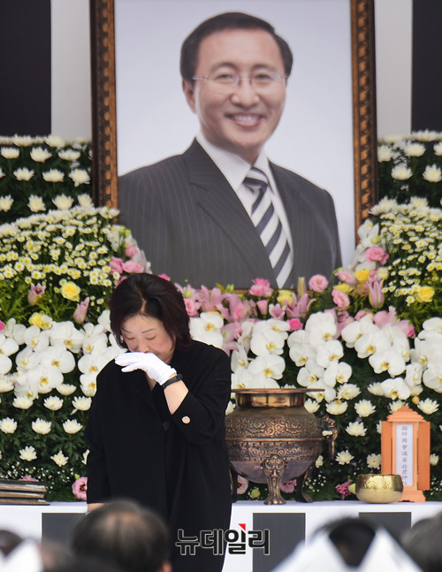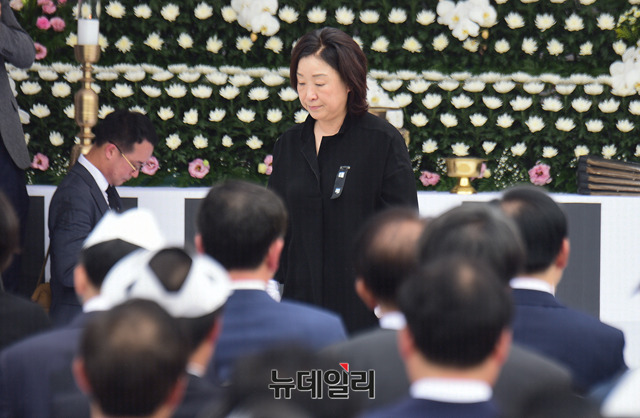 故 노회찬 정의당 의원의 영결식 27일 오전 국회에서 열린 가운데 심상정 의원이 헌화한 후 돌아서고 있다.