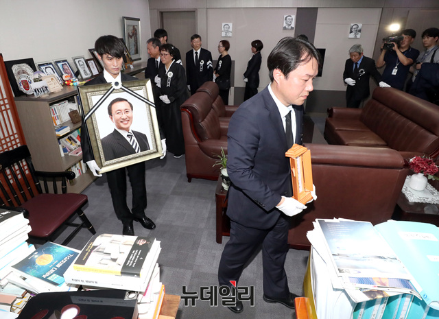 이정미 정의당 대표와 심상정 의원, 유가족 등이 27일 오전 국회에서 고 노회찬 원내대표 영결식을 마친 후 영정을 들고 의원회관 사무실을 둘러보고 있다.
