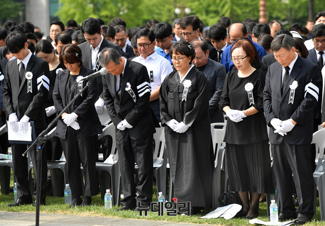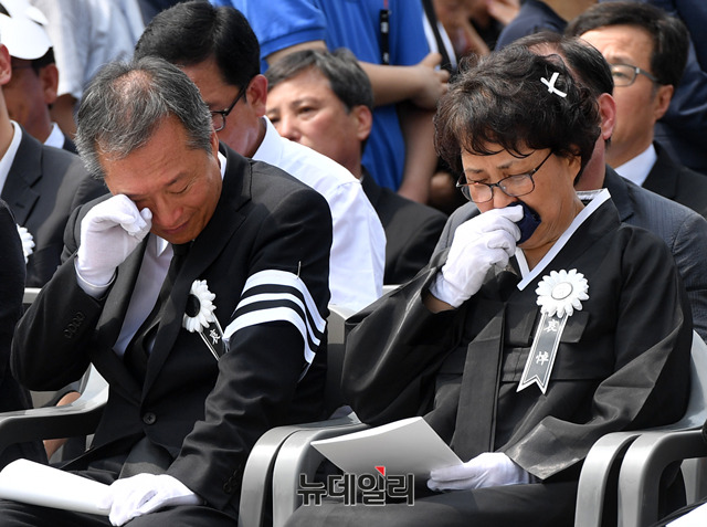 故 노회찬 정의당 의원의 영결식 27일 오전 국회에서 열린 가운데 부인 김지선 씨(오른쪽) 등 유족들이 눈물을 흘리고 있다.