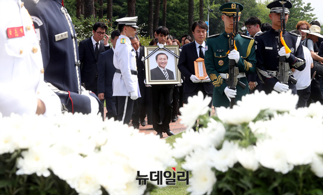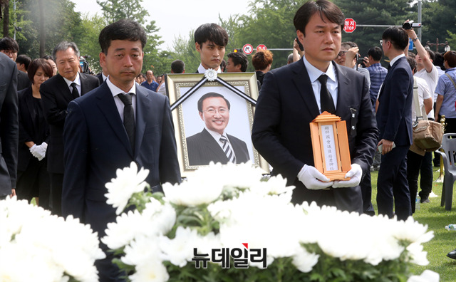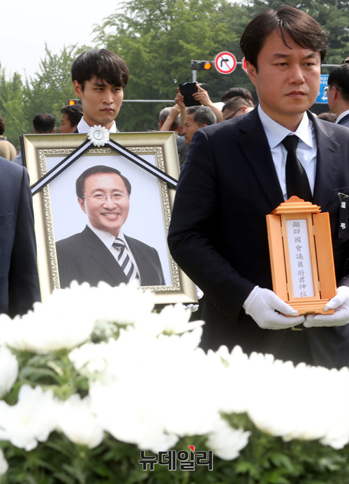 故 노회찬 정의당 의원의 영결식이 27일 오전 국회에서 열린 가운데 노 의원의 영정이 들어서고 있다.