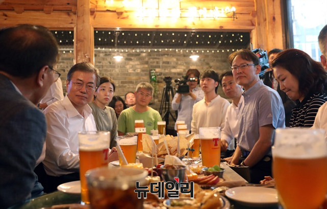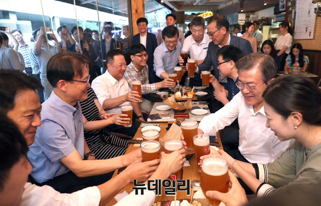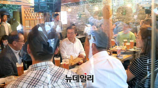 문재인 대통령이 26일 오후 '퇴근길 국민과의 대화 일환'으로 서울 광화문 인근 호프집을 찾아 참석자들과 맥주를 마시며 대화하고 있다. 이 자리에는 박용만 대한상의회장, 청년 구직자, 경력단절 여성구직자, 중소기업 대표, 편의점 점주, 인근 직장인 등이 참석했다. (사진=청와대)