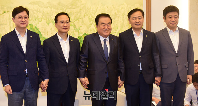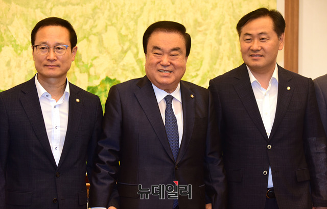 문희상 국회의장과 홍영표 더불어민주당 원내대표, 김관영 바른미래당 원내대표가 30일 오전 국회에서 열린 국회의장-원내대표 회동에서 기념사진을 촬여하고 있다. 이날 김성태 자유한국당 원내대표는 개인사정으로 회의에 불참했다.