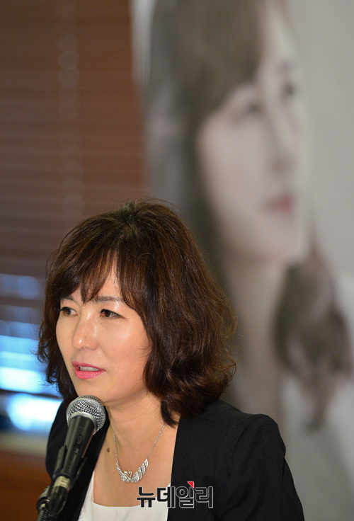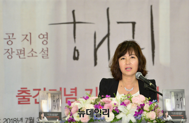 공지영 작가가 30일 오전 서울 중구 한국프레스센터에서 열린 장편소설 '해리' 출간 기자간담회에 참석해 책 소개를 하고 있다.
