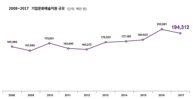 청탁금지법의 여파로 지난해 기업의 문화예술 지원 규모가 6년 만에 줄었다.한국메세나협회(회장 김영호)가 회원사 등 총 382개 기업을 대상으로 '2017년 기업의 문화예술 지원 현황 조사' 결과 우리나라 기업의 문화예술 지원 규모는 전년 대비 4.1%(82억6900만 원) 감소한 1943억1200만 원으로 집계됐다.기업의 문화예술 지원 규모가 감소한 건 6년만이다. 지원 규모 뿐 아니라 지원 건수도 2016년 대비 3.3% 감소한 1415건이다. 다만 지원 기업의 수가 533개사로 2016년 대비 7.2% 늘었다. 이는 기업들의 소액 지원이 증가한 것으로 분석된다.유형별로 상황을 살펴보면 문화예술단체의 공연, 전시를 지원하는 후원·협찬· 파트너십 등에 투입된 금액은 373억 원으로 2016년 대비 18.8% 줄었다. 2016년 시행된 청탁금지법으로 인해 선물 상한액 5만원을 초과하는 공연초대, 티켓 구매를 조건으로 한 협찬 활동 등이 위축된 결과로 보인다.미술관과 콘서트홀 등 기업 출연 재단이 운영하는 문화예술 인프라 지원 금액 역시 2016년 대비 5.8%가 감소했다. 장기적인 경기 침체와 함께 2016년 '미르∙K-스포츠재단' 사태 이후 기업들의 기부금 집행에 대한 내부 기준을 강화하고, 기부금을 축소한 탓이다.