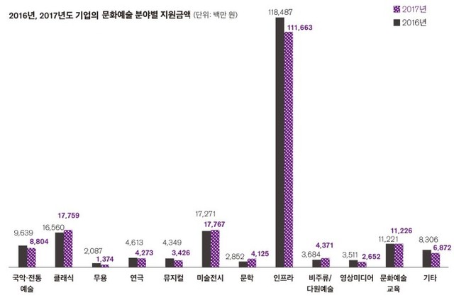 조선업과 철강 산업의 불황으로 인해 조선 및 중공업 산업군의 지원 규모가 46억9200만 원 감소한 것도 2017년 예술지원 금액 감소에 영향을 미친 것으로 나타났다.분야별 지원금액은 전년 대비 5.8%가 줄어든 인프라 지원액이 1116억6300만 원으로 가장 높게 집계됐다. 미술∙전시(177억6700만 원)와 클래식(177억5900백만) 분야는 각각 2.9%, 7.2% 소폭 증가해 눈길을 끈다.문화예술교육 분야는 전체적인 기업 예술지원 감소세에도 불구하고 112억2600만 원으로 전년도와 유사한 수준이다. 비주류·다원 예술과 문학 분야는 전년 대비 지원 규모가 각각 18.6%, 44.6%로 늘었다. 반면 국악·전통예술, 연극, 뮤지컬, 영상·미디어, 무용에 대한 지원은 2016년에 이어 감소했다.