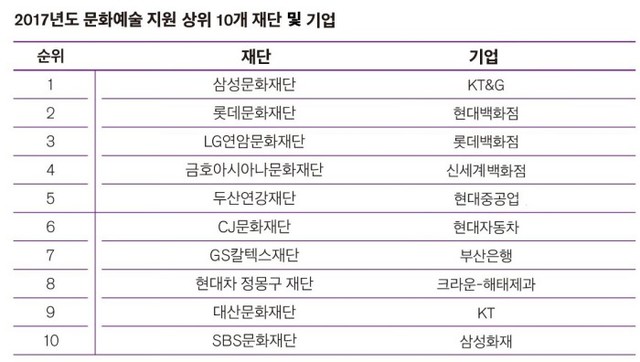 지원 주체별 현황을 보면 기업부문에서는 홍대, 춘천, 논산 등에서 상상마당을 운영하고 있는 KT&G가 1위를 기록했으며 현대백화점, 롯데백화점, 신세계백화점, 현대중공업이 등이 뒤를 이었다. 개별 기업의 문화예술 지원 총액은 1078억3500만원(55.5%)이다.기업 출연 재단 부문은 삼성문화재단, 롯데문화재단, LG연암문화재단, 금호아시아나문화재단, 두산연강재단 1~5위 순이었다. 기업들이 출연한 재단의 지원 총액은 864억7600만 원으로 전체 문화예술 지원금액의 44.5%를 차지했다.한국메세나협회는 "청탁금지법의 영향으로 많은 기업의 문화예술 지원 활동이 감소한 것을 확인할 수 있었다. 기업의 문화예술 지원 활동이 지닌 사회적 중요도를 고려해 융통성 있는 법 해석 및 적용을 통한 합리적인 제도 보완이 필요하다"고 강조했다.[사진=한국메세나협회]
