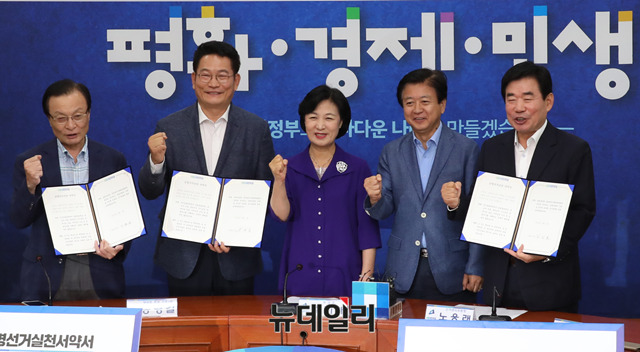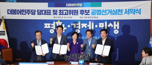 추미애 더불어민주당 대표(가운데)가 1일 오전 국회에서 열린 공명선거 실천 서약식에서 당 대표 후보인 이해찬, 송영길, 김진표 후보와 파이팅을 외치고 있다.