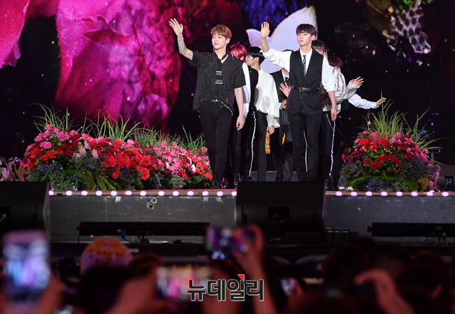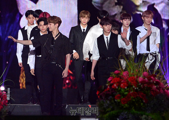 그룹 워너원(Wanna One : 강다니엘, 박지훈, 이대휘, 김재환, 옹성우, 박우진, 라이관린, 윤지성, 황민현, 배진영, 하성운)이 1일 오후 서울 구로구 고척스카이돔에서 열린 '케이스타 2018 코리아 뮤직 페스티벌(Korea Music Festival)'에 참석해 플라워카펫을 걷고 있다.