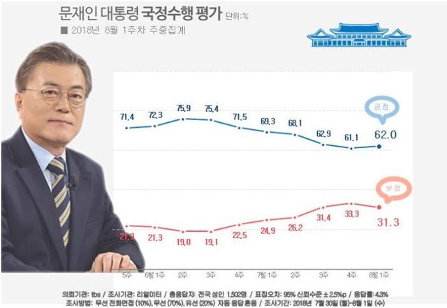 한편 이날 리얼미터가 발표한 주중 집계 여론조사 결과는 2018년 7월 30일(월)부터 8월 1일(수)까지 사흘 동안 전국 19세 이상 유권자 34,994명에 통화를 시도, 최종 1,502명이 응답을 받아 도출한 결과다. 응답률은 4.3%를 기록했고 조사 방법은 무선 전화면접(10%), 무선(70%)·유선(20%) 자동응답 혼용 방식, 무선전화(80%)와 유선전화(20%) 병행 무작위생성 표집틀을 통한 임의 전화걸기 방법으로 실시했다. 통계보정은 2018년 1월말 행정안전부 주민등록 인구통계 기준 성, 연령, 권역별 가중치 부여 방식으로 이루어졌고, 표본오차는 95% 신뢰수준에서 ±2.5%p이다.