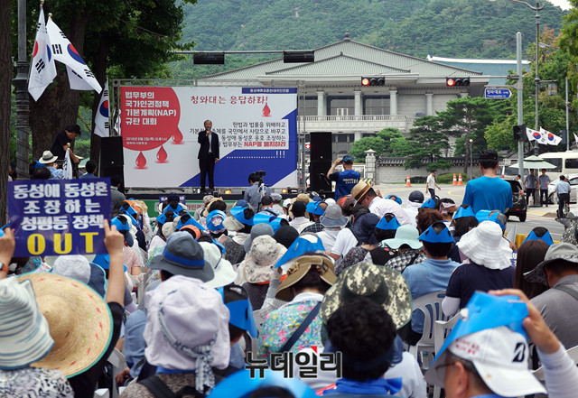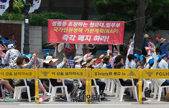 동성애동성혼반대국민연합 참가자들이 2일 오후 청와대 사랑채 앞에서 열린 '법무부의 국가인권정책 기본계획(NAP) 규탄 대회'에 참석해 구호를 외치고 있다.