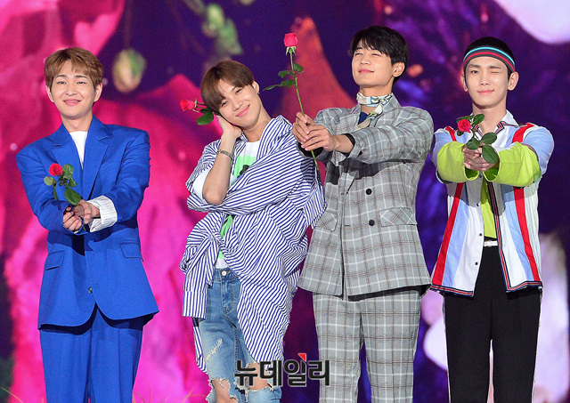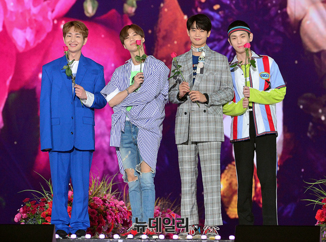 그룹 샤이니(SHINee : 온유, Key, 민호, 태민)가 2일 오후 서울 구로구 고척스카이돔에서 열린 '케이스타 2018 코리아 뮤직 페스티벌(Korea Music Festival)'에 참석해 포즈를 취하고 있다.