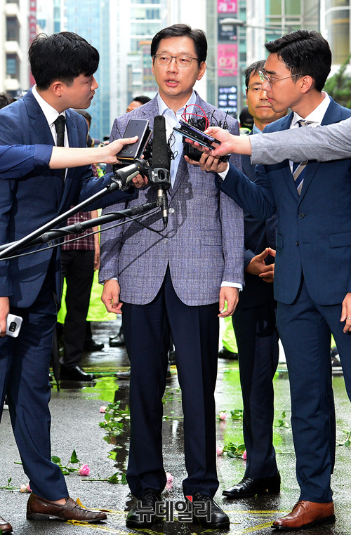 김경수 경남지사가 6일 오전 서울 서초구 '드루킹 댓글 조작 사건' 진상규명을 위한 특별검사 사무실에 피의자 신분으로 출석해 질문에 답하고 있다.