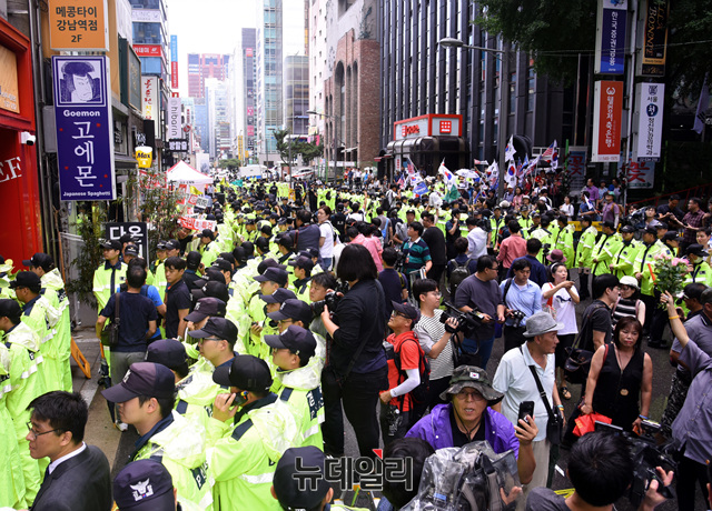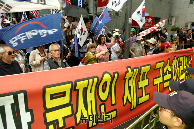 대한애국당원들이 6일 오전 서울 서초구 '드루킹 댓글 조작 사건' 진상규명을 위한 특별검사 사무실 앞에서 김경수 경남지사의 소환에 앞서 구호를 외치고 있다.