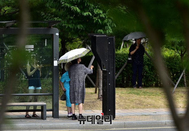 가을로 들어서는 입추(立秋)인 7일 오전 경기 안양시의 한 시내버스 정류장에서 시민들이 양산으로 태양을 가리며 버스를 기다리고 있다. 기상청은 전국에 구름이 많고, 내륙 곳곳에는 소나기가 올것으로 예보했다. (경기 안양=뉴데일리 정상윤 기자)