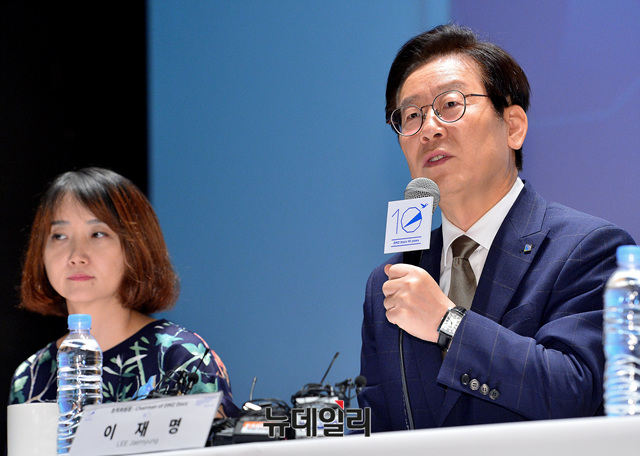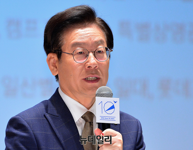 이재명 경기지사가 7일 오전 서울 종로구 서울역사박물관에서 열린 '제10회 DMZ 국제다큐영화제 기자회견'에 참석해 발언하고 있다.이날 이 지사는 "영화제 하면 화려한 조명 아래 아주 많은 사람들이 즐거운 표정으로 시작할 줄 알았는데 경찰서 취조 분위기"라며 "다큐의 특성 때문인 것이냐"고 말했다.'DMZ 국제다큐영화제'는 비무장지대 DMZ(Demilitarized zone)를 배경으로 국내외 다양한 다큐멘터리를 한 자리에서 만날 수 있는 영화제다.