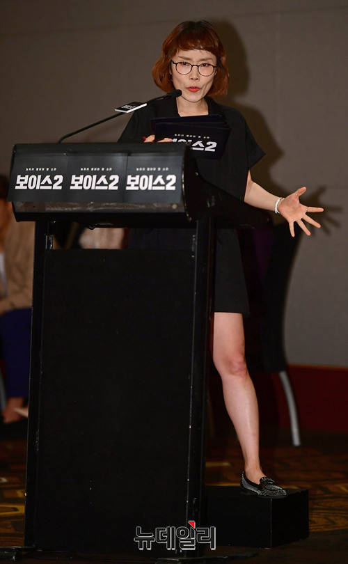 방송인 박슬기가 7일 오후 서울 영등포구 콘래드서울 호텔에서 열린 OCN 드라마 '보이스2(연출 이승영, 극본 마진원)' 제작보고회에서 출연배우를 소개하고 있다.