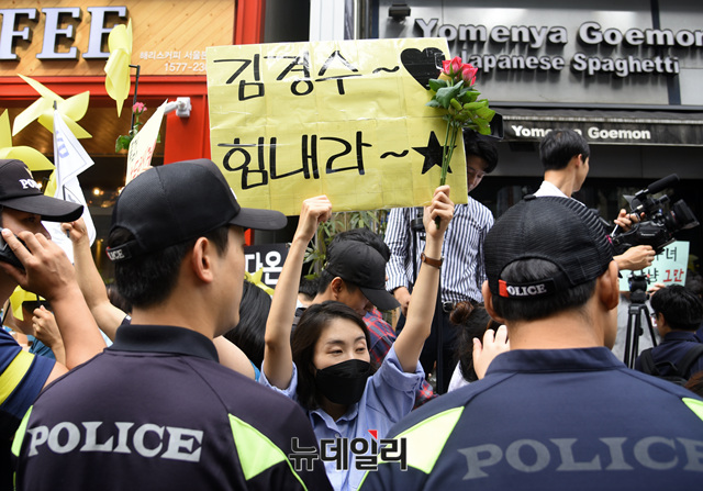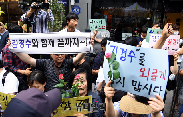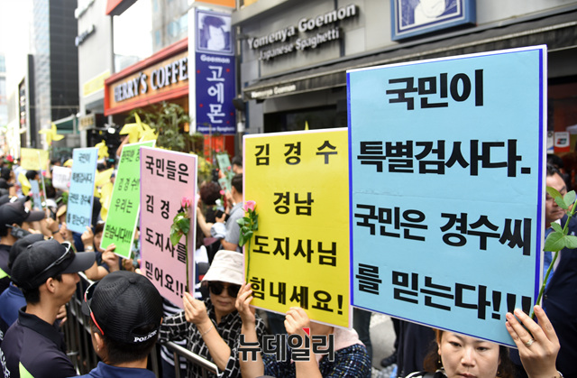김경수 경남지사의 특검 재소환을 앞둔 9일 오전 서울 서초구 '드루킹 댓글 조작 사건' 진상규명을 위한 특별검사 사무실 앞에서 지지자들이 피켓을 들고 있다.