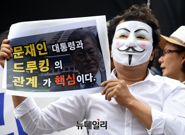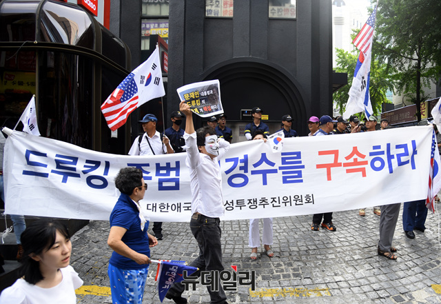 대한애국당 여성투쟁추진위원회 등 우파단체 회원들이 김경수 경남지사의 특검 재소환을 앞둔 9일 오전 서울 서초구 '드루킹 댓글 조작 사건' 진상규명을 위한 특별검사 사무실 앞에서 김경수 구속수사 촉구 집회를 하고 있다