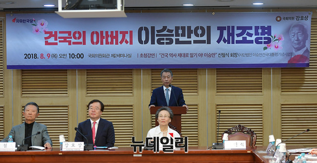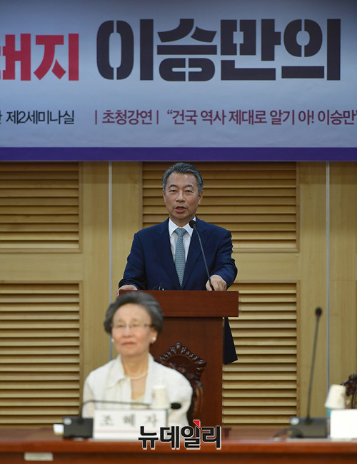 정종섭 자유한국당 의원이 9일 오전 국회 의원회관에서 열린 '건국의 아버지 이승만의 재조명' 초청강연에 참석해 축사를 하고 있다.