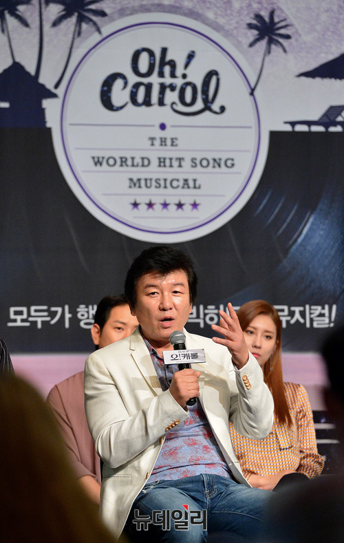 방송인 주병진이 9일 오후 노보텔 앰배서더 서울 강남에서 열린 뮤지컬 '오!캐롤(Oh! Carol)' 제작발표회에 참석해 질문에 답하고 있다. 주병진은 파라다이스 리조트 쇼의 유머러스한 MC 허비(HARVEY) 역을 맡았다.