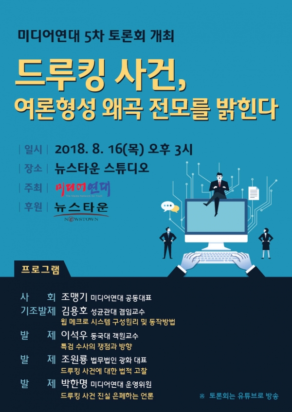 미디어연대(공동대표 조맹기·황우섭)는 오는 16일 뉴스타운 스튜디오에서 '드루킹 사건, 여론형성 왜곡 전모를 밝힌다'는 주제로 토론회를 열고, '웝 메크로 시스템 구성원리 및 동작방법' '특검 수사의 쟁점과 방향' '드루킹 사건 진실 은폐하는 언론' 등의 기조발제를 통해 작위적인 댓글이 여론형성을 왜곡시켜온 사건의 전모를 밝혀낼 방침이다.