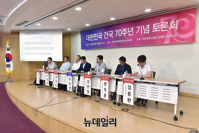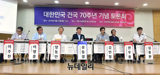 대한민국 건국 70주년 기념 토론회가 13일 오후 국회 의원회관에서 열린 가운데 자유민주진영과 진보민주진영 각 3인이 토론을 진행하고있다. 왼쪽부터 이주천 전 원광대 사학과 교수, 이영훈 서울대 명예교수, 양동안 한국학중앙연구원 명예교수, 유동열 자유민주연구원장, 김민철 민족문제연구소 연구위원, 전우용 한국학중앙연구원 객원교수, 심용환 성공회대 외래교수.
