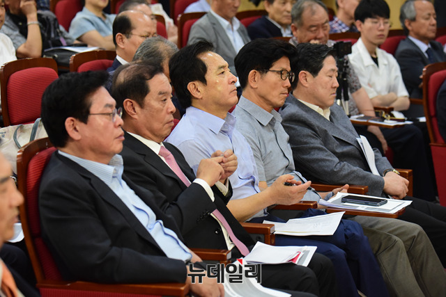 대한민국 건국 70주년 기념 토론회가 13일 오후 국회 의원회관에서 열린 가운데 자유한국당 정우택 의원, 김병준 혁신비상대책위원장, 심재철 의원, 김문수 전 경기도지사, 유기준 의원이 토론을 지켜보고 있다.