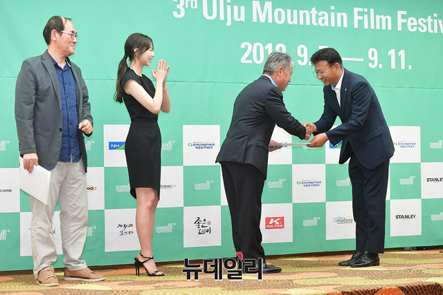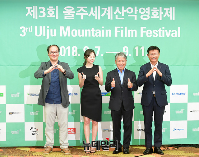 배창호 울주세계산악영화제 집행위원장, 홍보대사 안소희, 엄홍길, 이선호 이사장(왼쪽부터)이 13일 오후 서울 중구 프레지던트 호텔에서 열린 제3회 울주세계산악영화제 기자간담회에서 기념 촬영을 하고 있다.