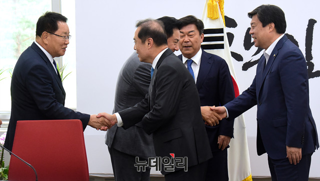 박성택 중소기업중앙회 회장이 14일 오전 국회에서 김병준 자유한국당 비상대책위원장을 예방해 악수를 나누고 있다.