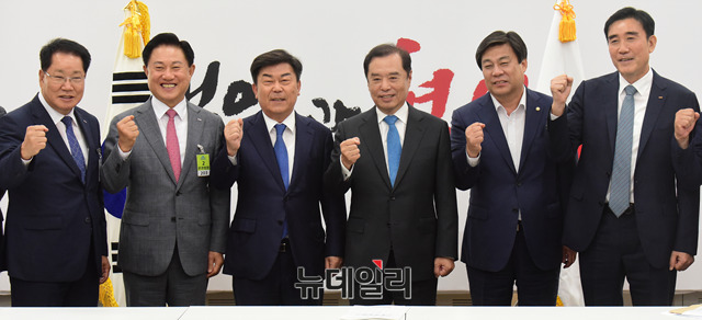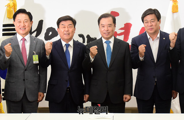 박성택 중소기업중앙회 회장이 14일 오전 국회에서 김병준 자유한국당 비상대책위원장을 예방해 기념사진을 촬영하고 있다.