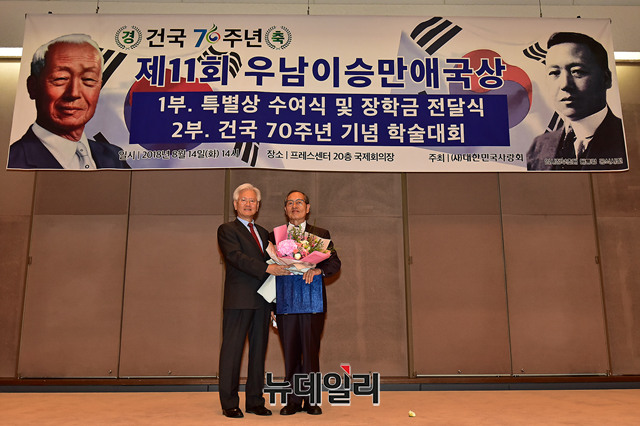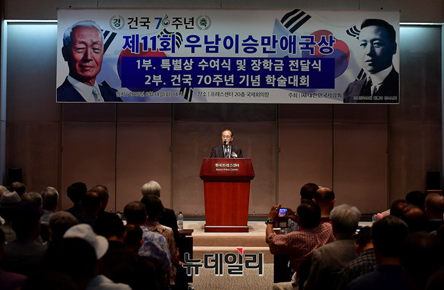 인보길 뉴데일리 회장이 14일 오후 서울 중구 한국프레스센터 국제회의장에서 열린 제11회 우남이승만애국상 시상식에서 수상소감을 밝히고 있다.제11회 우남이승만애국상 특별상에는 개인부문 △김용삼 기획실장(박정희기념재단) △인보길 회장(뉴데일리) △주옥순 대표(우먼채널) 청년대학생부문 △김동근 대표(대한민국청년대학생연합) △김은구 회장(서울대학교 트루스포럼) △오종택 회장(한국대학생포럼) △이진영 의장(한국대학생포럼)이 각각 수상했다.우남이승만애국상은 건국대통령 이승만 박사의 애국애족 정신을 계승 발전시키려는 목적으로 제정돼 대한민국의 정통성과 정체성 수호에 헌신한 애국시민단체 및 개인에게 시상해 온 상이다.