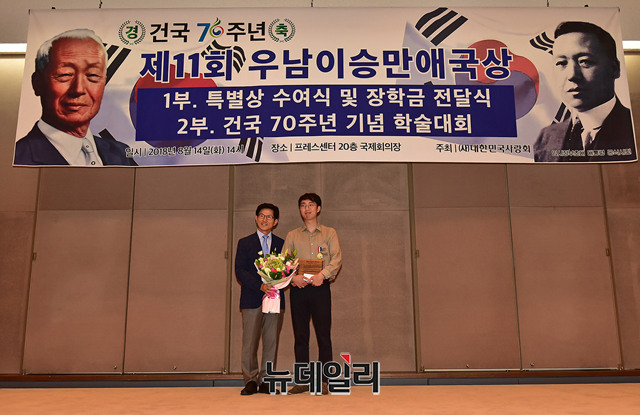 김용삼 박정희기념재단 기획실장이 14일 오후 서울 중구 한국프레스센터 국제회의장에서 열린 제11회 우남이승만애국상 시상식에서 특별상 수상후 기념 촬영을 하고 있다.제11회 우남이승만애국상 특별상에는 개인부문 △김용삼 기획실장(박정희기념재단) △인보길 회장(뉴데일리) △주옥순 대표(우먼채널) 청년대학생부문 △김동근 대표(대한민국청년대학생연합) △김은구 회장(서울대학교 트루스포럼) △오종택 회장(한국대학생포럼) △이진영 의장(한국대학생포럼)이 각각 수상했다.우남이승만애국상은 건국대통령 이승만 박사의 애국애족 정신을 계승 발전시키려는 목적으로 제정돼 대한민국의 정통성과 정체성 수호에 헌신한 애국시민단체 및 개인에게 시상해 온 상이다.