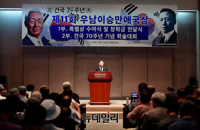 류근일 전 조선일보 주필이 14일 오후 서울 중구 한국프레스센터 국제회의장에서 열린 제11회 우남이승만애국상 시상식에서 축사를 하고 있다.제11회 우남이승만애국상 특별상에는 개인부문 △김용삼 기획실장(박정희기념재단) △인보길 회장(뉴데일리) △주옥순 대표(우먼채널) 청년대학생부문 △김동근 대표(대한민국청년대학생연합) △김은구 회장(서울대학교 트루스포럼) △오종택 회장(한국대학생포럼) △이진영 의장(한국대학생포럼)이 각각 수상했다.우남이승만애국상은 건국대통령 이승만 박사의 애국애족 정신을 계승 발전시키려는 목적으로 제정돼 대한민국의 정통성과 정체성 수호에 헌신한 애국시민단체 및 개인에게 시상해 온 상이다.