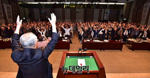장경순 전 국회부의장이 14일 오후 서울 중구 한국프레스센터 국제회의장에서 열린 제11회 우남이승만애국상 시상식에서 만세삼창을 하고 있다.제11회 우남이승만애국상 특별상에는 개인부문 △김용삼 기획실장(박정희기념재단) △인보길 회장(뉴데일리) △주옥순 대표(우먼채널) 청년대학생부문 △김동근 대표(대한민국청년대학생연합) △김은구 회장(서울대학교 트루스포럼) △오종택 회장(한국대학생포럼) △이진영 의장(한국대학생포럼)이 각각 수상했다.우남이승만애국상은 건국대통령 이승만 박사의 애국애족 정신을 계승 발전시키려는 목적으로 제정돼 대한민국의 정통성과 정체성 수호에 헌신한 애국시민단체 및 개인에게 시상해 온 상이다.