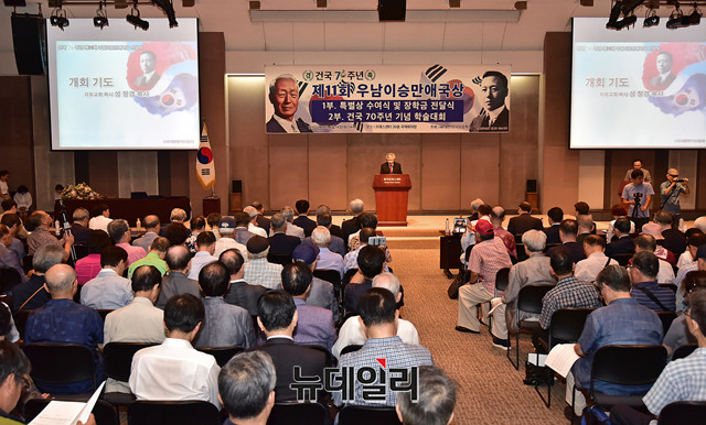 성창경 자유교회 목사가 14일 오후 서울 중구 한국프레스센터 국제회의장에서 열린 제11회 우남이승만애국상 시상식에 개회 기도를 하고 있다.제11회 우남이승만애국상 특별상에는 개인부문 △김용삼 기획실장(박정희기념재단) △인보길 회장(뉴데일리) △주옥순 대표(우먼채널) 청년대학생부문 △김동근 대표(대한민국청년대학생연합) △김은구 회장(서울대학교 트루스포럼) △오종택 회장(한국대학생포럼) △이진영 의장(한국대학생포럼)이 각각 수상했다.우남이승만애국상은 건국대통령 이승만 박사의 애국애족 정신을 계승 발전시키려는 목적으로 제정돼 대한민국의 정통성과 정체성 수호에 헌신한 애국시민단체 및 개인에게 시상해 온 상이다.