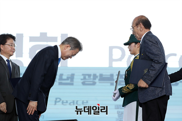 문재인 대통령이 15일 오전 서울 용산구 국립중앙박물관 열린마당에서 열린 제73주년 광복절과 정부수립 70주년 경축식에 참석해 경축사를 하고 있다. (사진=청와대)